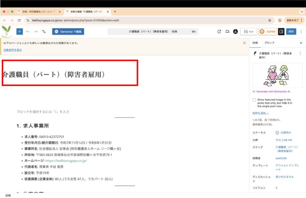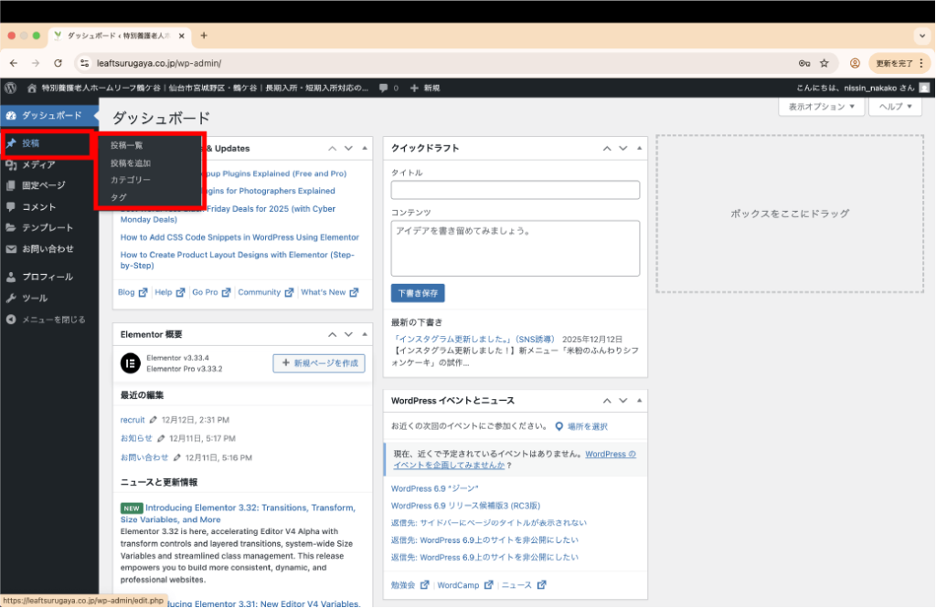 - カテゴリー:記事の分類を選択します。(例: 「お知らせ」「日々の様子」)