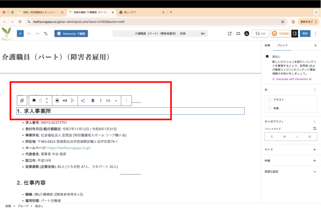 - 本文:タイトル下の本文エリアで、記事を作成します。