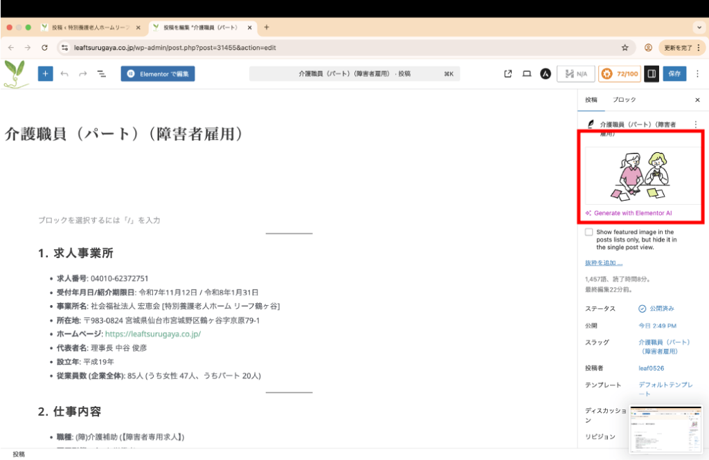 - アイキャッチ画像:記事を一覧で表示する際に使われるサムネイル画像を設定します。